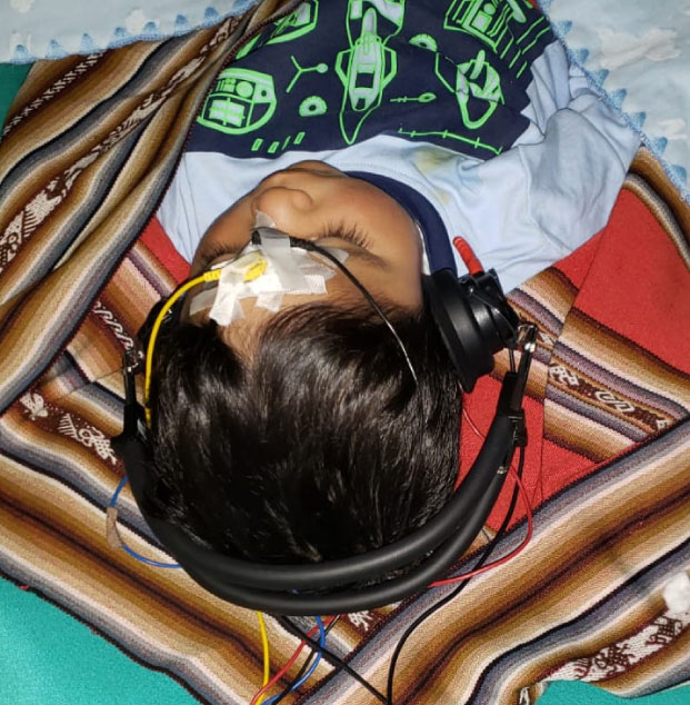 Niño pequeño al que se le están realizando unos Potenciales Evocados Auditivos de estado estable (PEAee). Para la aplicación del estímulo utilizamos auriculares de inserción con tips desechables, adaptados a la edad del paciente y al tamaño de su conducto auditivo. Son cómodos y son los que más reducen los artefactos y el ruido ambiente. Se emplean estímulos acústicos tonales repetitivos multifrecuenciales modulados en amplitud, es decir, sonidos de distintas frecuencias que van variando en intensidad. Permiten la evaluación simultánea de varias frecuencias audiométricas e incluso de ambos oídos a la vez, lo que reduce el tiempo de realización.